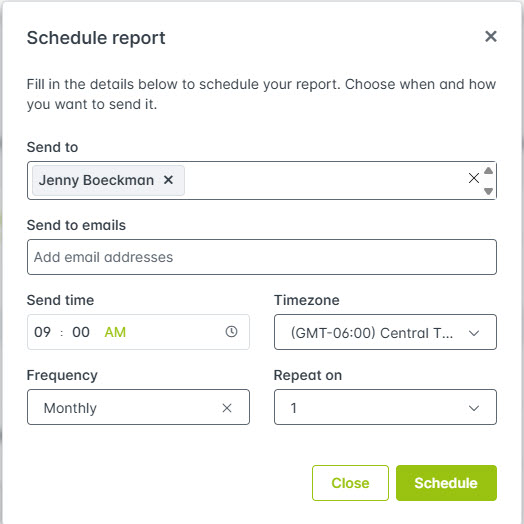 - Send Time and Time zone: choose the time and zone for the report notification to be delivered